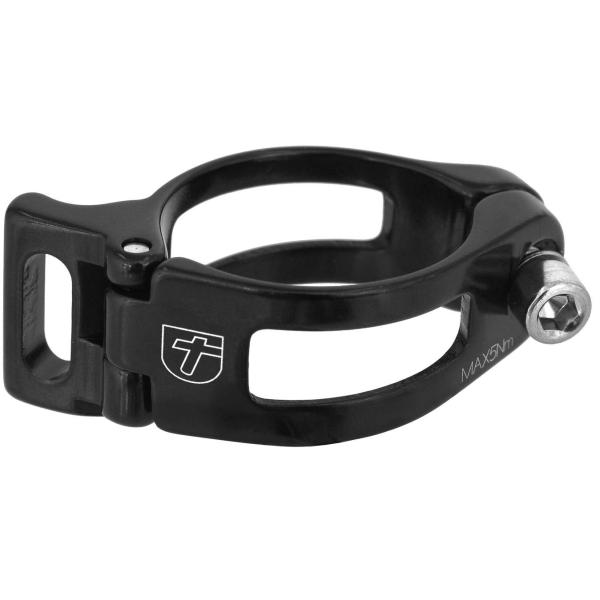 Mit der schwarzen Trivio-Schaltwerkschelle lässt sich jedes beliebige Modell eines anschweißbaren Umwerfers einfach am Rahmenrohr montieren. Erhältlich in den Durchmessern 31,8 mm und 34,9 mm.
