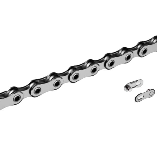 La cadena CN-M9100 XTR y Dura-Ace de 12 velocidades es una cadena fuerte y ligera con una durabilidad extra larga. Esta cadena tiene un plato interior extendido, por lo que hay menos fricción alrededor de los dientes del plato. Esta cadena también ha recibido el revestimiento Shimano Sil-TEC, que amplía aún más su durabilidad.